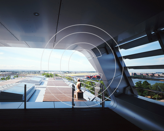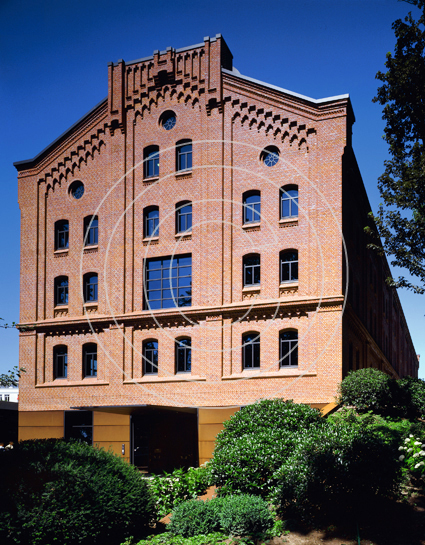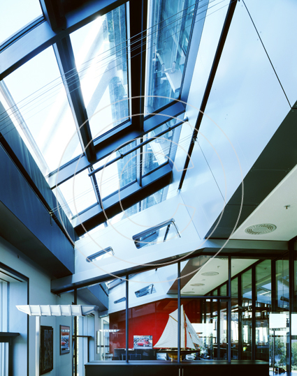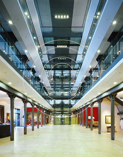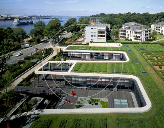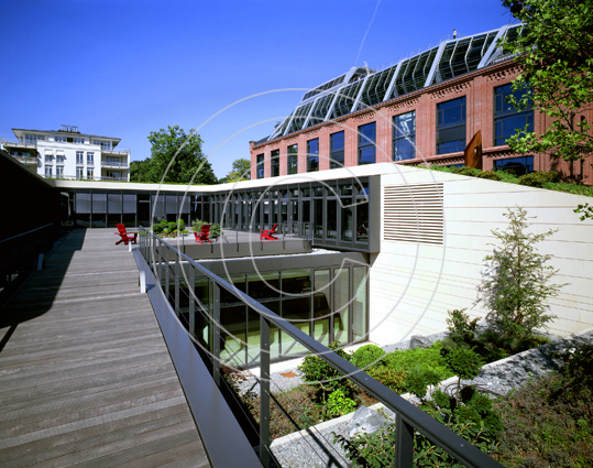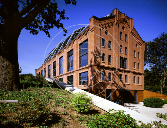 Bürowelten im Elbschloßpark, Hamburg. Ein Denkmal wandelt sein Gesicht. Aus einer Mälzerei im Hamburger Stadtteil Nienstedten wird ein signifikantes Bürogebäude. Das Historische Ziegelhaus bekommt einen gläsernen Schiffskörper als Dachaufbau.