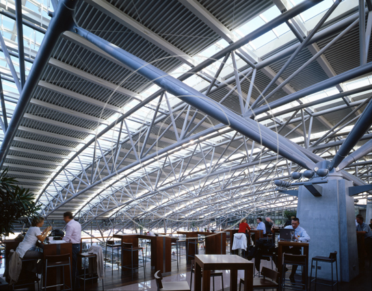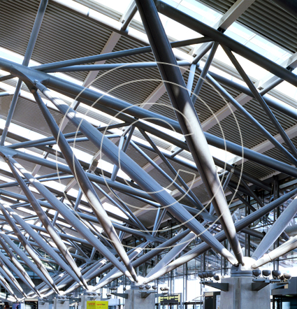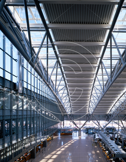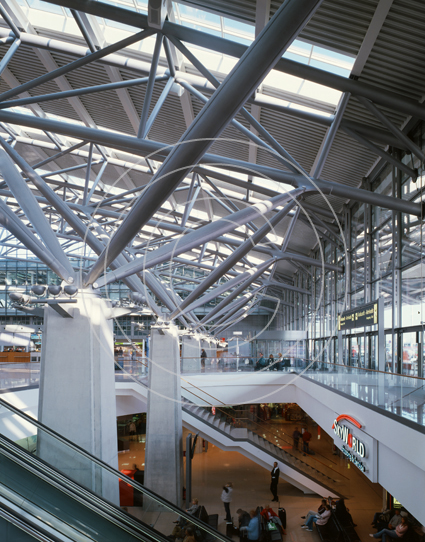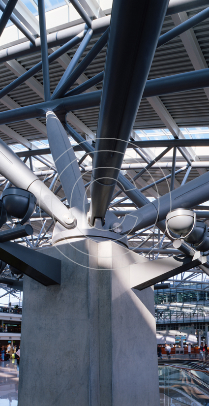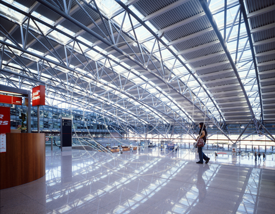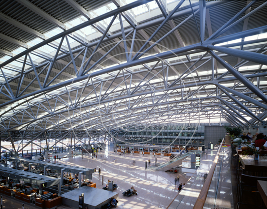 Flughafen Terminal 1, Hamburg. Das neue Terminal ist als weite, luftige und tageslichtdurchflutete Halle konzipiert. Trotz der lichten Spannweite von 62m ist das Dach eine leichte Konstruktion.