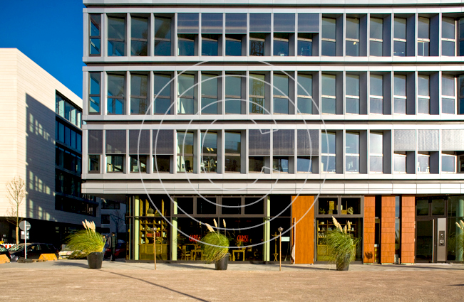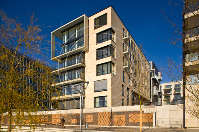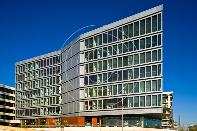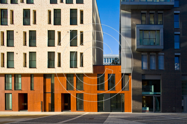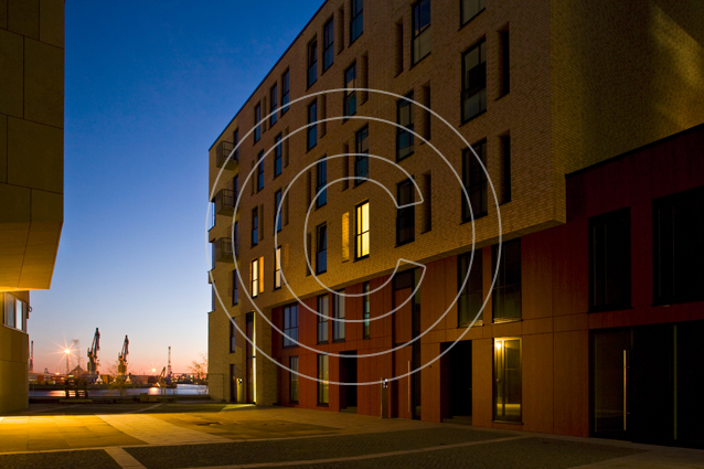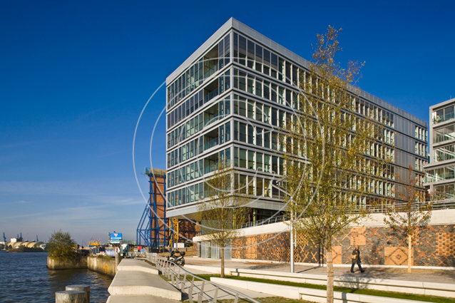Dieses Wohn- und Bürogebäude liegt in direkter Nachbarschaft zur Elbphilharmonie. Die ausgefallene Aluminium-Fassade des Bürogebäudes bildet hier einen reizvollen Gegenpart zum gläsernen Aufsatz des neuen Hamburger Wahrzeichens.