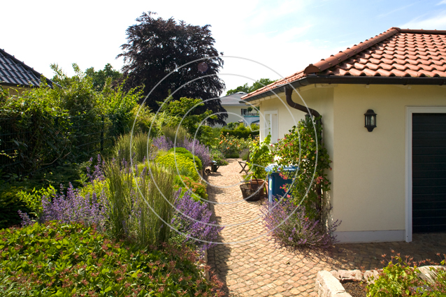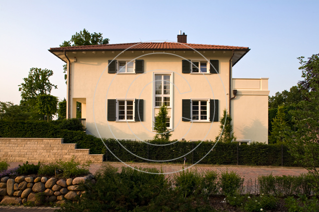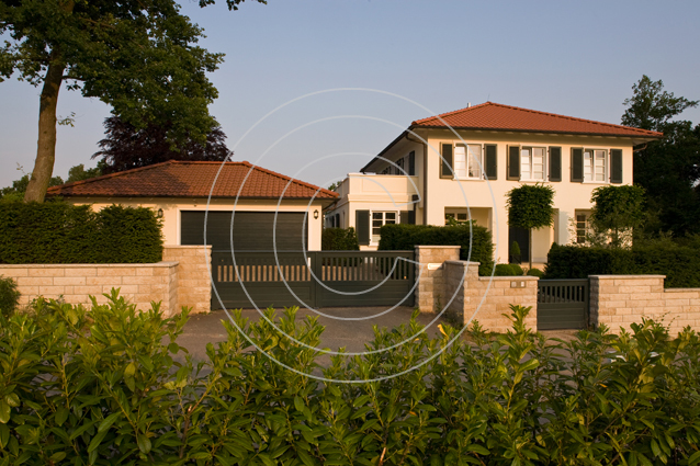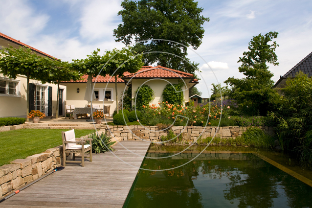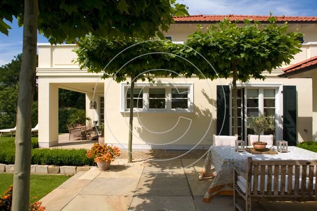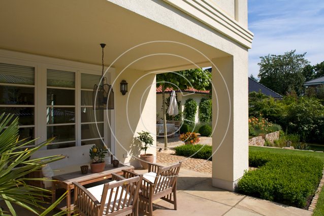 Mit ihren sanften Gelbtönen strahlt diese im italienischen Stil gehaltene Villa in Großhansdorf viel Wärme aus. Viel Liebe zum Detail beinhaltet der Garten; hier sorgt Lavendel für einen Farbkontrast. Wenige Meter von der Terrasse entfernt befindet sich eine schöne Teichanlage.