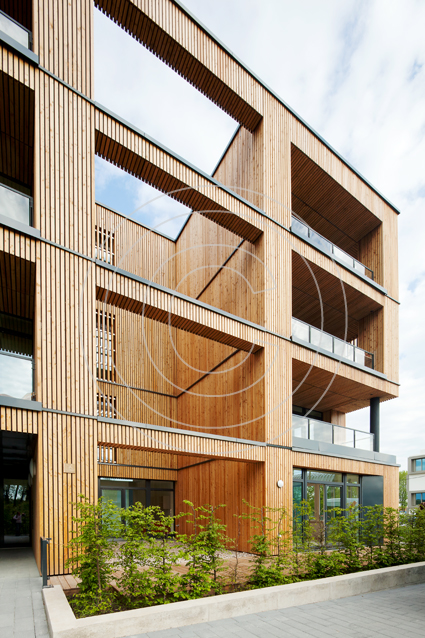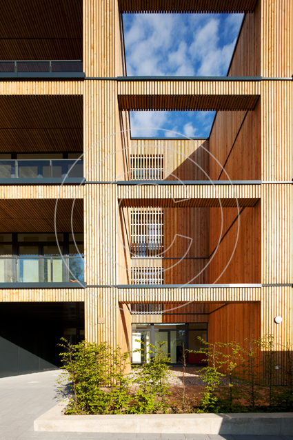 Das würfelartige Gebäude wird von Einschnitten und Lichthöfen unterbrochen, die Tageslicht in das Innere des Hauses eindringen lassen. Die dabei entstehenden Nischen dienen den Bewohnern als Balkone.