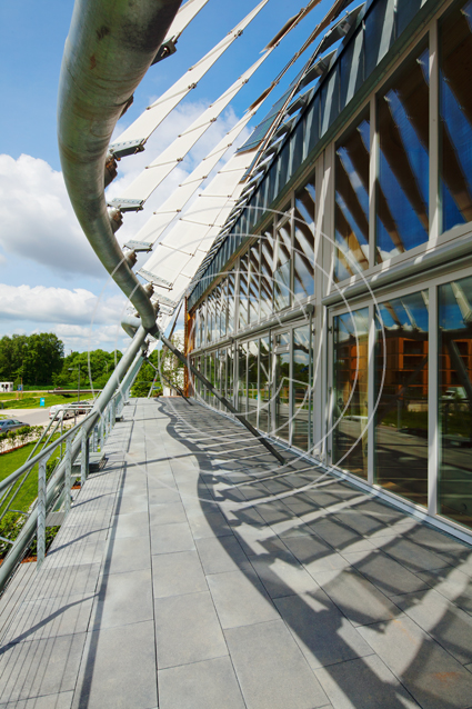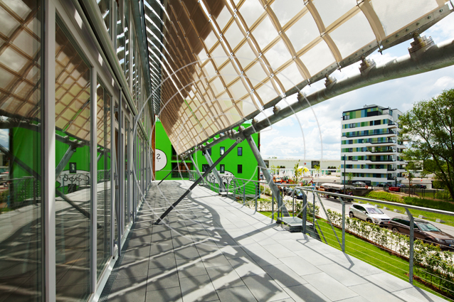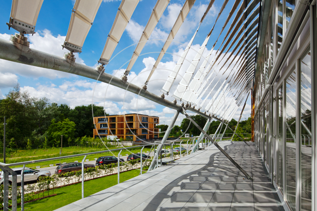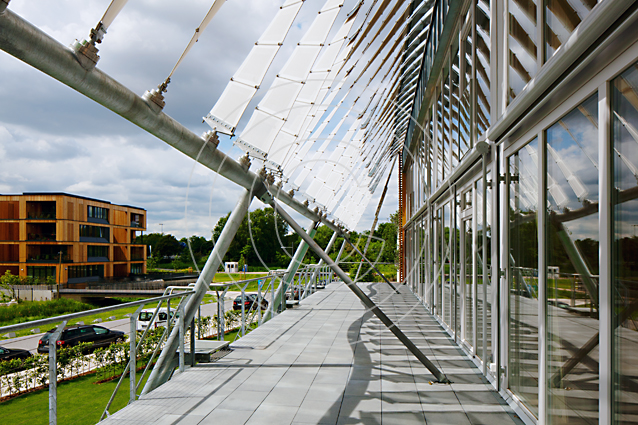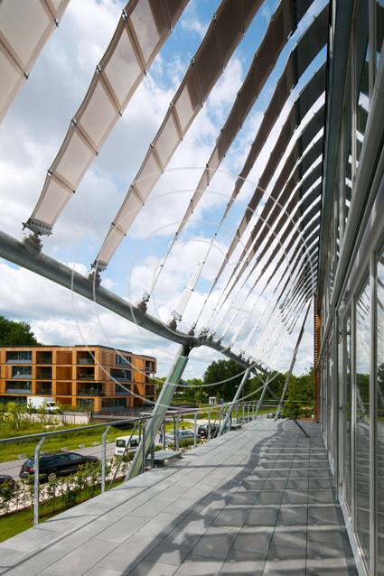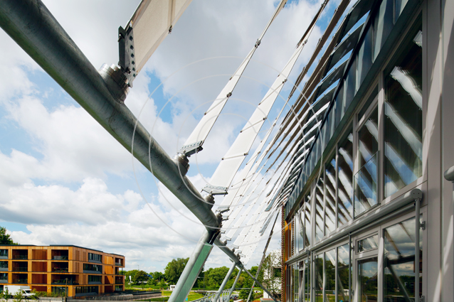 Das Soft House nimmt sich die Natur zum Vorbild: die textile Membranfassade an der Südseite des Hauses reagiert flexibel auf Sonneneinstrahlung, ähnlich wie eine Sonnenblume, die sich stets dem Sonnenlicht zuwendet. In die Membran eingearbeitete Photovoltaik-Zellen können so das Sonnenlicht optimal zur Energieproduktion nutzen. Gleichzeitig spenden die Fassadenelemente im Sommer Schatten, im Winter minimieren sie Energieverluste und lassen Licht tiefer in die Räume einfallen.